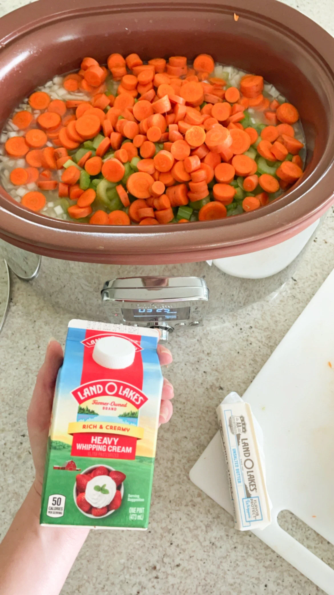 Chop your onion, carrots, and celery and place them in the slow cooker or Dutch oven with the chicken breasts. Pour the chicken stock, heavy cream, melted butter and flour over the chicken and veggies and stir together. Add in chicken bullion, thyme, and basil as well as a splash of olive oil. You can always add more seasoning to taste after the chicken is cooked. Let the mixture cook for about two hours on 350 degrees. Your crockpot will look similar to the image below. Remember to stir occasionally.